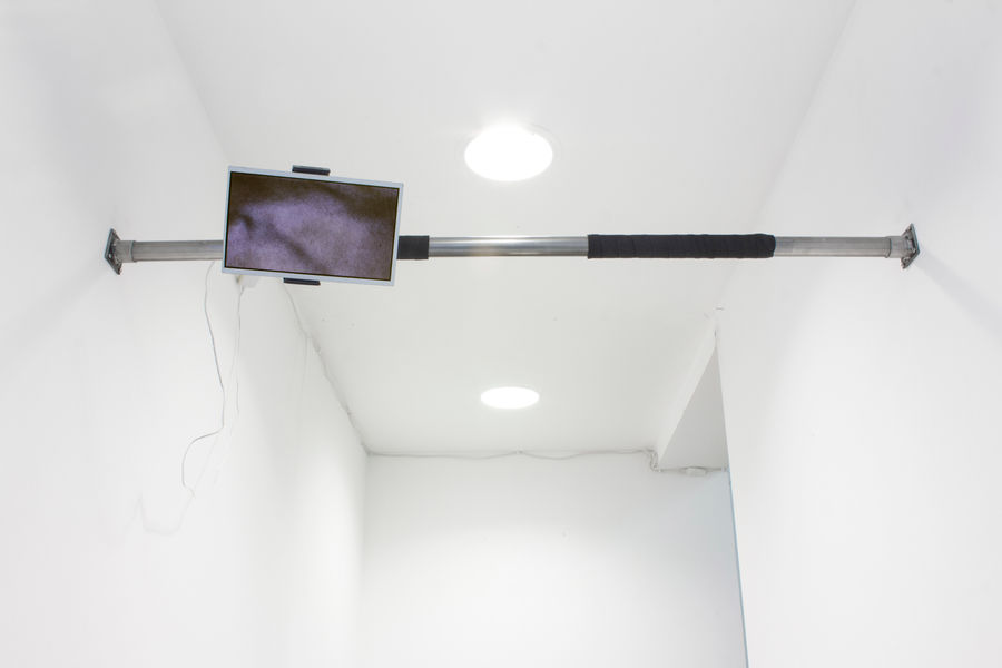 KIN (2020): video loop, 10” monitor, steel bar, grip tape